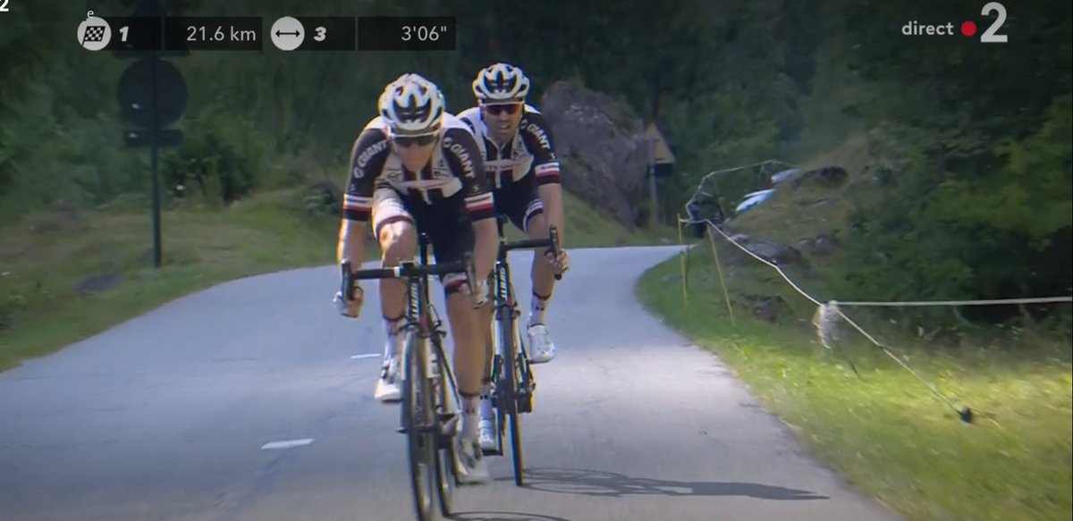 K němu se pro změnu z úniku stahuje Soran Kraigh Andersen a navádí lídra Sunwebu zatáčkami, řítí se jako blázen, až na něj Dumoulin křikne: „Jeď rychle, ale neriskuj tolik.“