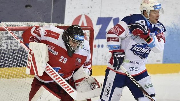 Brankář Olomouce Jan Lukáš a Jan Hruška z Brna.