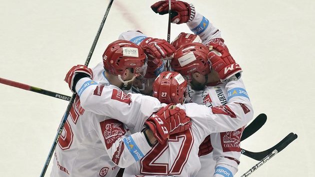 Hokejisté Třince se radují z gólu.