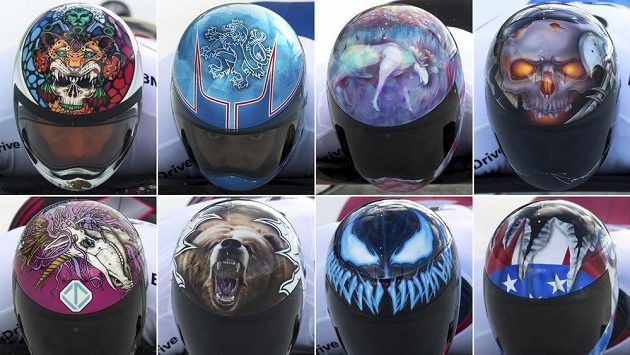 Zajímavá studie vzorů na helmách závodníků na mistrovství světa ve skeletonu v kanadském Whistleru. Druhá helma nahoře zleva patří české závodnici Anna Fernstädtové.