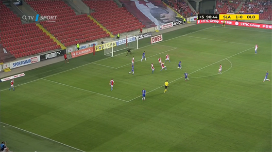 Slávistický pravý záložník se u pravého praporku zapomněl, protože naháněl unikajícího Václava Jemelku. Olomoucký stoper v pádu odcentroval, domácí balon odkopli jen za vápno, odkud ho Martin Nešpor napálil zpět před bránu.