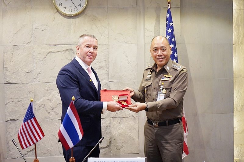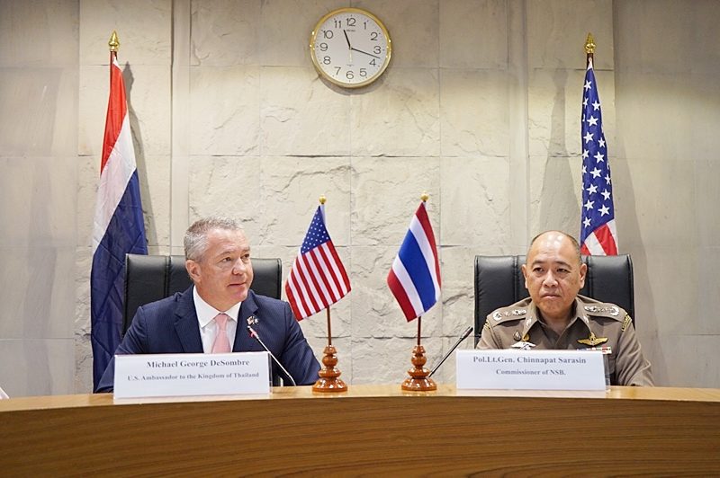 วันที่ 18 มิ.ย. ที่กองบัญชาการตำรวจปราบปรามยาเสพติด (บช.ปส.) ไมเคิล จอร์จ ดีซอมบรี เอกอัครราชทูตสหรัฐอเมริกาประจำประเทศไทย พร้อมคณะเจ้าหน้าที่จากสำนักงานปราบปรามยาเสพติดสหรัฐอเมริกา และสำนักงานกิจการยาเสพติดและการบังคับใช้กฎหมายระหว่างประเทศ เข้าพบ พล.ต.ท.ชินภัทร สารสิน ผบช.ปส. เพื่อมอบยานพาหนะ อุปกรณ์ที่ใช้ในการปฏิบัติงาน และอุปกรณ์อื่น ๆ ที่เกี่ยวข้องในการป้องกันและปราบปรามยาเสพติด ให้แก่ บช.ปส.