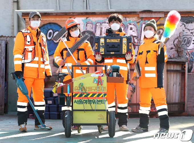 (서울=뉴스1) 이성철 기자 = 4일 서울 영등포에 위치한 작업실 옥상에서 '서울아까워라센터 유기사물구조대' 관계자들이 자신들이 만든 지구 모양 작품과 함께 포즈를 취하고 있다. 2020.11.4/뉴스1