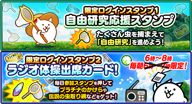 「なつやすみの自由研究ログインスタンプ」は毎日ログインすることで、にゃんチケやレアチケ、「伝説の虫取り網」などがゲットできます。