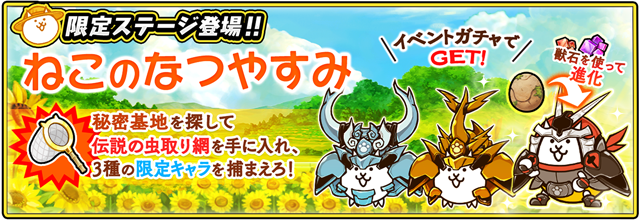 「伝説の虫取り網」を集めて限定EXキャラ「古びたタマゴ:N202」「カブトネコ」「クワガタネコ」などをゲットしましょう!