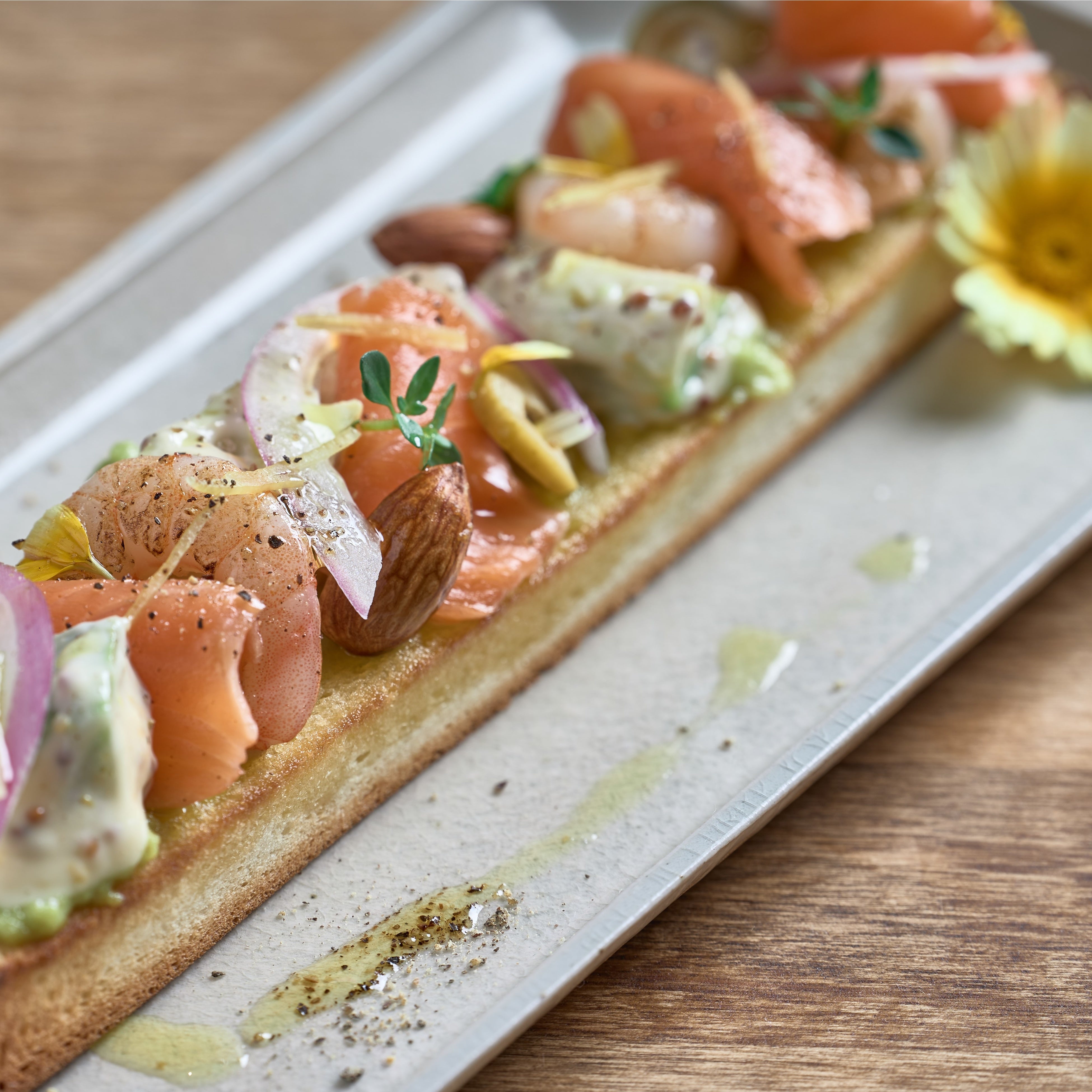 少し甘さを感じる食パンにサーモンや野菜を色鮮やかに盛り付けた気分のあがるオープンサンドです。