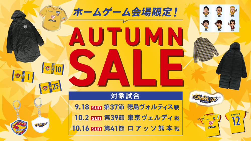 9月18日(日)徳島戦、10月2日(日)東京V戦、10月16日(日)熊本戦のホームゲーム3試合にてオータムセールを実施します!!