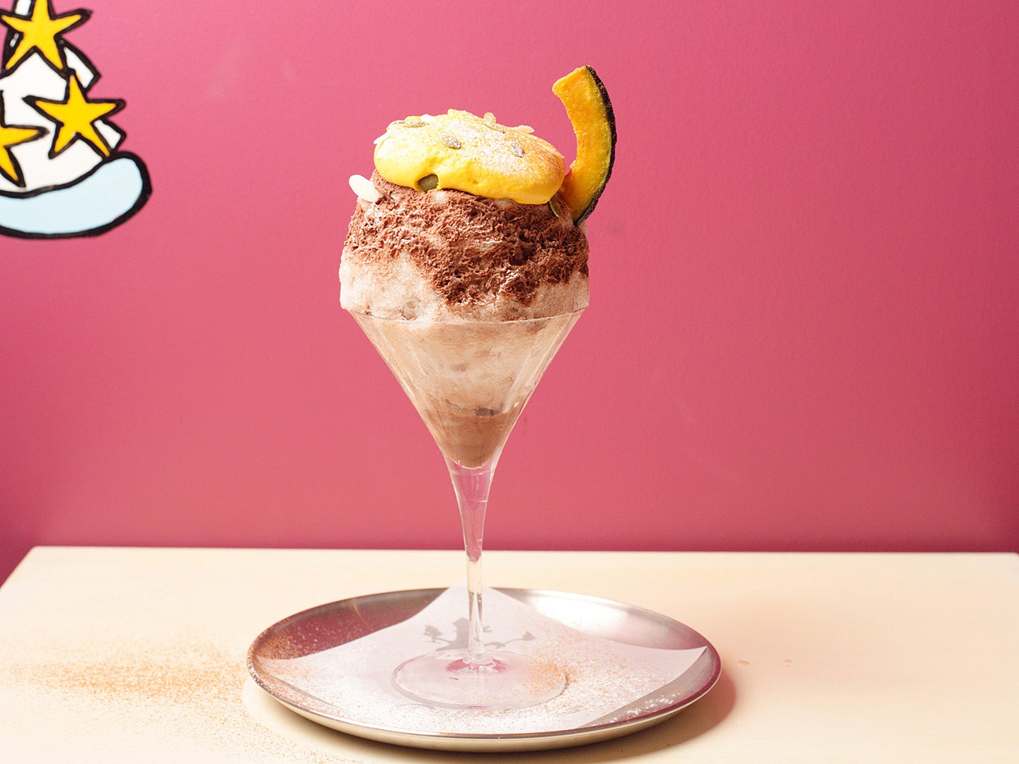 かき氷の上には、カボチャとラムのエスプーマクリームをかけ、カボチャの甘さとラムのほろ苦さを融合。