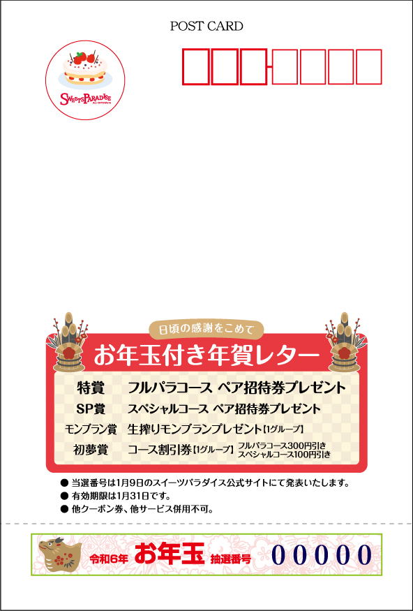 2024年1月1日より数量限定でスイパラ各店舗にて「スイパラ特製年賀状」を配布中♪